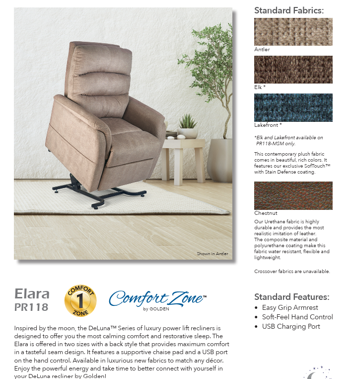 Inspired by the moon, the DeLuna™ Series of luxury power lift recliners is designed to offer you the most calming comfort and restorative sleep. The Elara is offered in a Medium/Small and Large size with a back style that provides maximum comfort in a tasteful seam design. It features a supportive chaise pad, and a USB port on the hand control. Available in luxurious new fabrics to match any décor. Enjoy the powerful energy and take time to better connect with yourself in your DeLuna recliner by Golden!