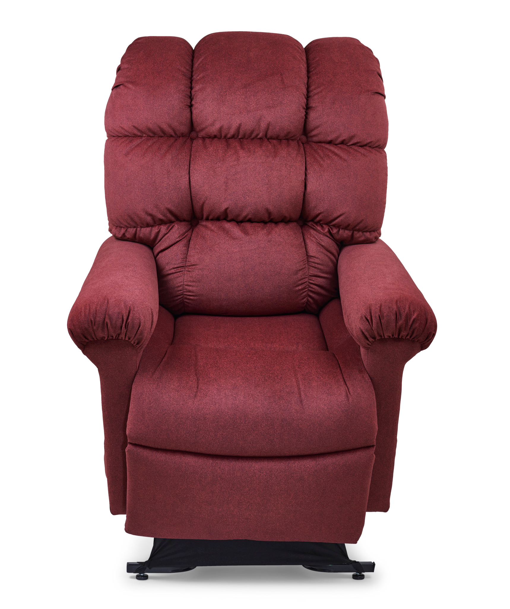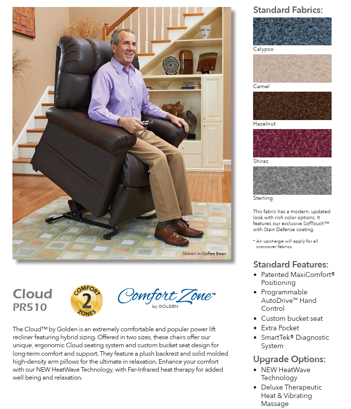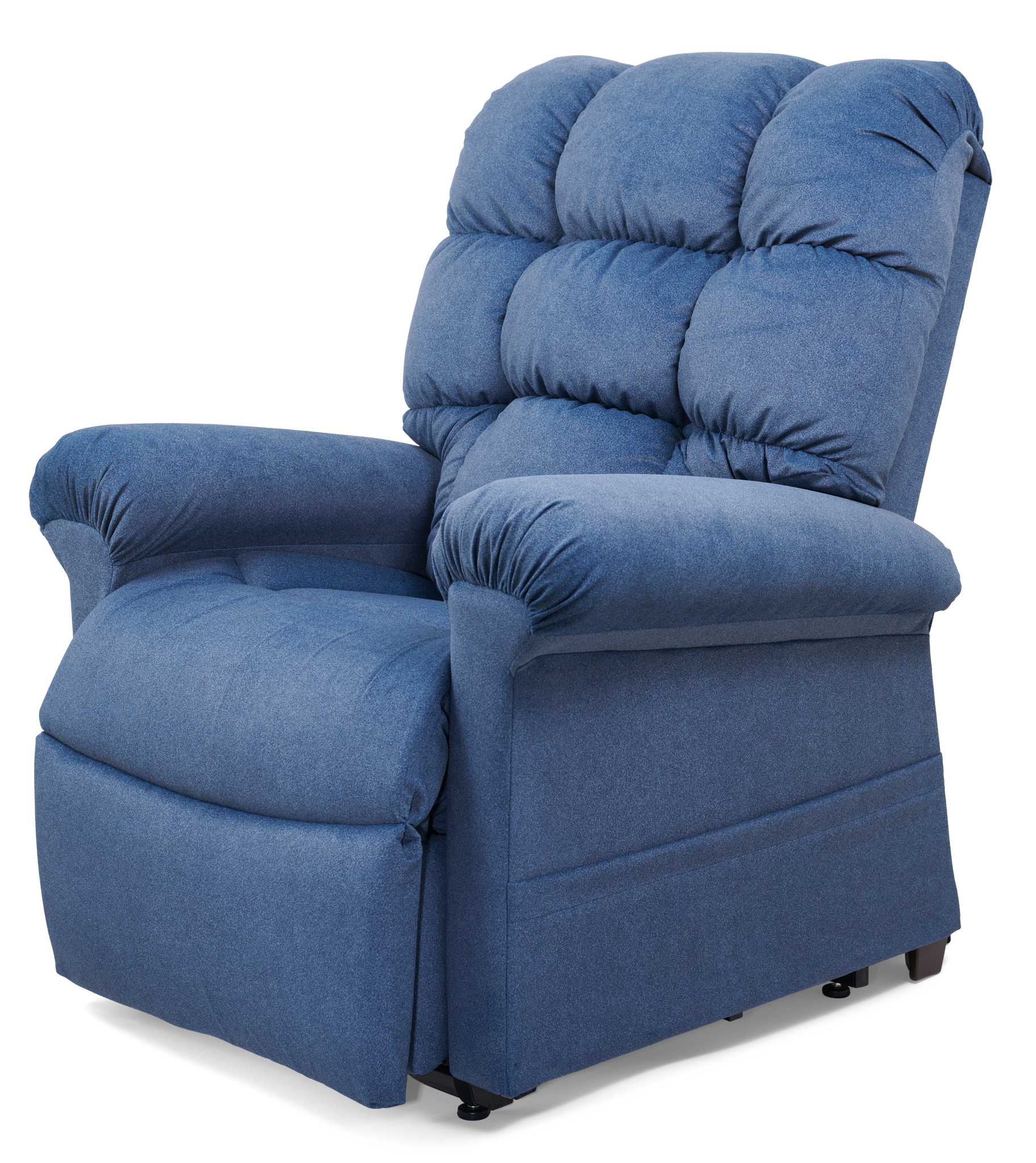 The Cloud™ by Golden is an extremely comfortable and popular power lift recliner featuring hybrid sizing. Offered in three sizes, these chairs offer our unique, ergonomic Cloud seating system and custom bucket seat design for long-term comfort and support. They feature a plush backrest and solid molded high-density arm pillows for the ultimate in relaxation. Enhance your comfort with our NEW HeatWave Technology, with Far-Infrared heat therapy for added well being and relaxation. The generous arms are made of Canadian memory foam to take your comfort to the next level. Experience the Golden comfort difference in our top selling power lift recline chair model!