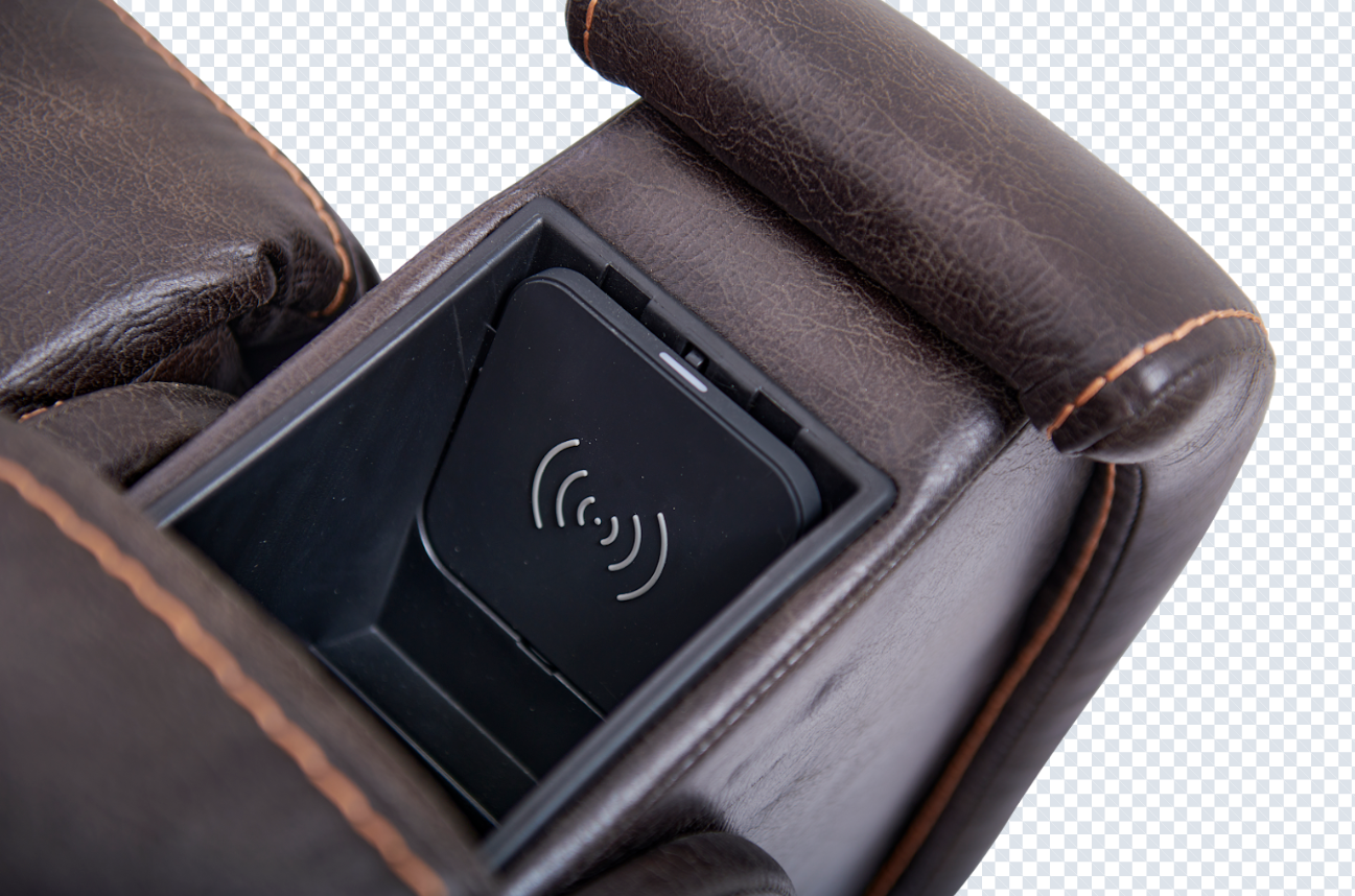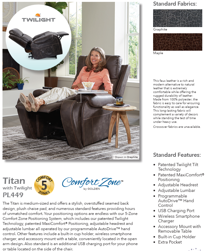 The Titan is medium-sized and offers a stylish, overstuffed seamed back design, plush chaise pad, and numerous standard features providing hours of unmatched comfort. Your positioning options are endless with our 5-Zone Comfort Zone Positioning System, which includes our patented Twilight Technology, patented MaxiComfort® Positioning, adjustable headrest and adjustable lumbar all operated by our programmable AutoDriveTM hand control. Other features include a built-in cup holder, wireless smartphone charger, and accessory mount with a table, conveniently located in the open arm design. Also standard is an additional USB charging port for your phone or tablet located on the side of the chair. Crossover fabrics are unavailable on this model.